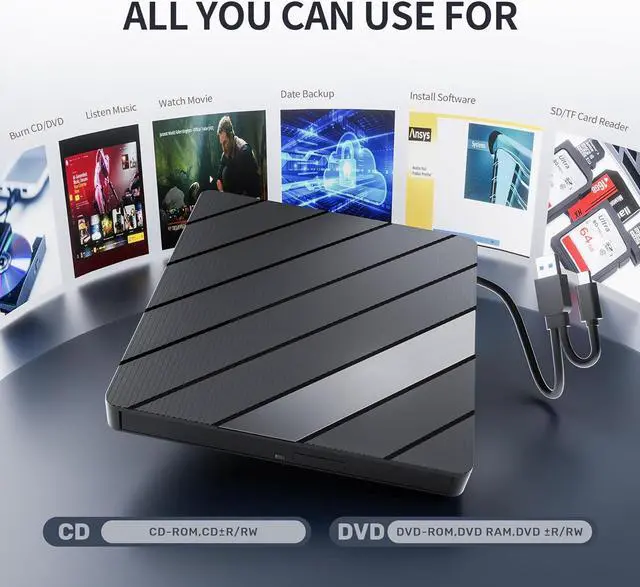 - Widely Compatible: CD DVD burner drive supports Windows 11/10/8/7,Windows XP/Vista, Linux, Mac OS and so on.(NOT SUPPORT: TV/Car/Tablet/Smartphone/Blu Ray Disc/Chromebook). Support for reading and writing CD±R/RW, DVD±R/RW, CD-ROM, DVD-RAM, VCD, and SVCD.You can use this cd dvd to usb converter to play music/CDs, play movies/DVDs, install software, or backup data to CD/DVD.