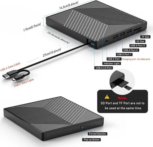 • External CD DVD DriveThis external dvd drive not only reads CDs and DVDs, but can also be used as a USB hub. Including 1*Type-C, 3*USB 2.0 Port, 1* USB 3.0 Port, 1*SD/TF Card Slot.The USB Hub makes it easy to connect the mouse, keyboard and other USB devices. You can also use the card reader function to transfer your photos, videos or data to PC.