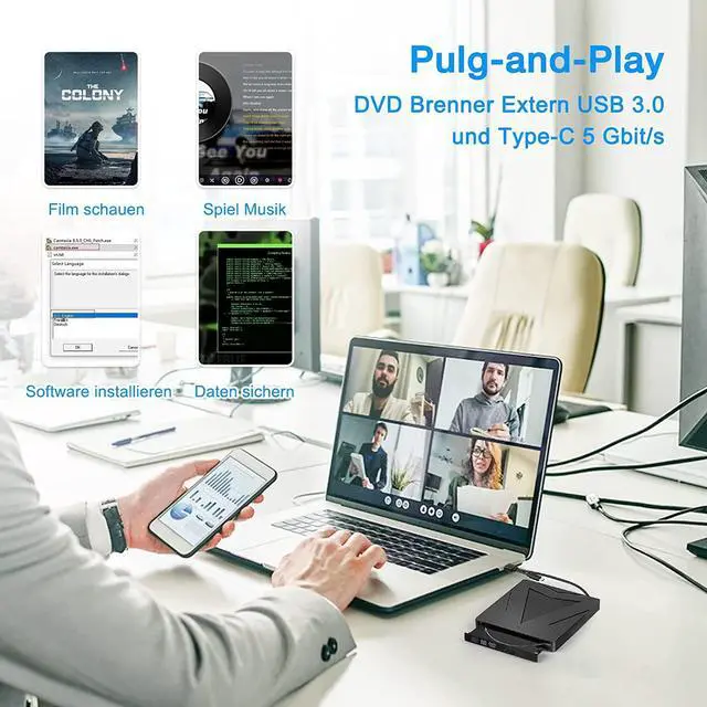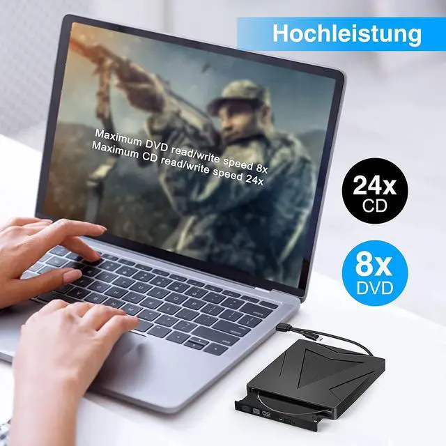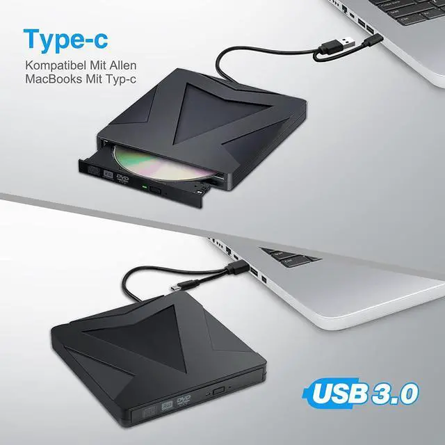 External USB 3.0 & USB C DVD CD Drive support Mac-book, PC, laptop. You can watch movies, player games, listen musics. Also can copy transfer files, movies to a CD/DVD, install software and creat backup discs etc.