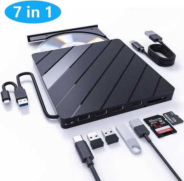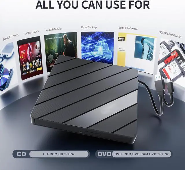 The external optical drive not only read CD DVD, but also can be used as an external laptop USB hub, including 1 USB 3.0 port, 3 USB 2.0 port, SD&TF card slot, compatible with USB hard drive, limited/wireless mouse& keyboard, computer radiator and other USB computer accessories. The card slots are perfect for transferring files by your camera from cards to your computer.