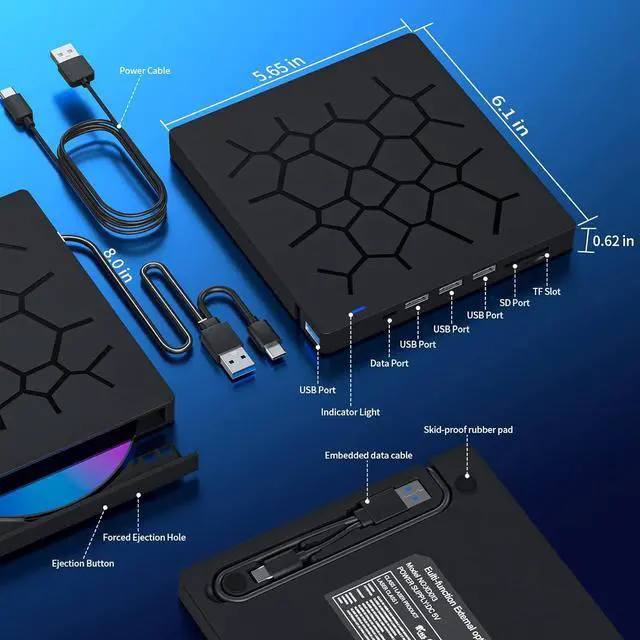 Our portable DVD player is not only a CD/DVD reader, but also a CD/DVD burner/burner, 4 port USB 3.0 hub, SD card reader, TF card reader (SD card and TF card are not used at the same time)