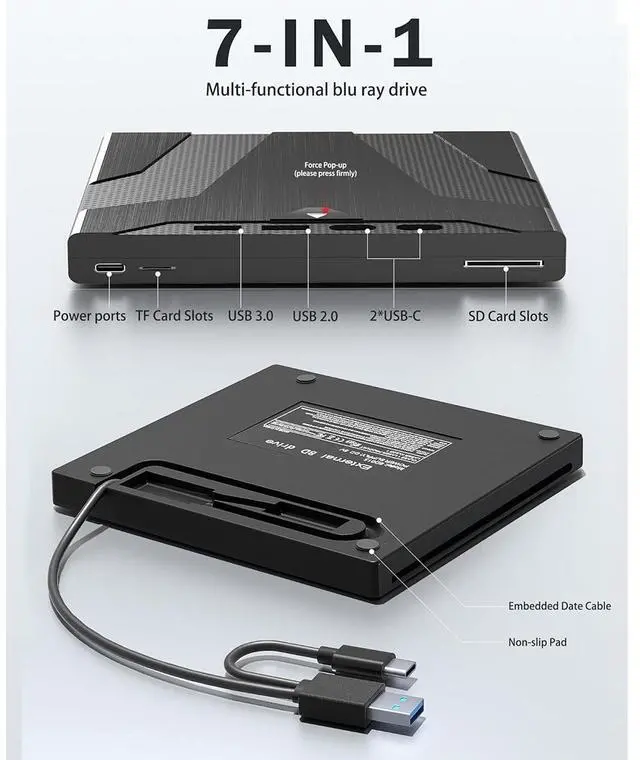 7-in-1 External Blu ray drive adopts a suction type design, which can be plugged in and quickly read by the computer, minimizing the wear and tear of your disc to the greatest extent possible. The top design features a manual pop-up button, it is easy to operate. This blue ray/dvd/cd player offers versatile features. ( It has 1 SD card slot, 1 TF card slot, 1 USB 3.0 port, 1 USB 2.0 port and 2 Type-C ports for data transfer. )
