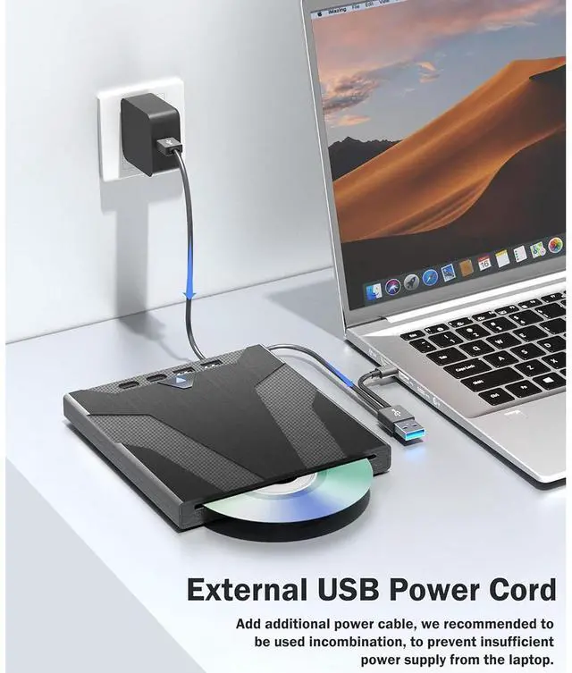 This blu ray dvd drive comes with a hidden USB 3.0 and Type-C computer data transfer cable. The transmission speed is up to 5GBPS, which is 6 times faster than traditional USB 2.0 interfaces. In additional, we provide an USB-C Power Cable. The 5V USB power cable can be connected to adapter to ensure stable performance, even in cases of power insufficiency, making it suitable for extended use.