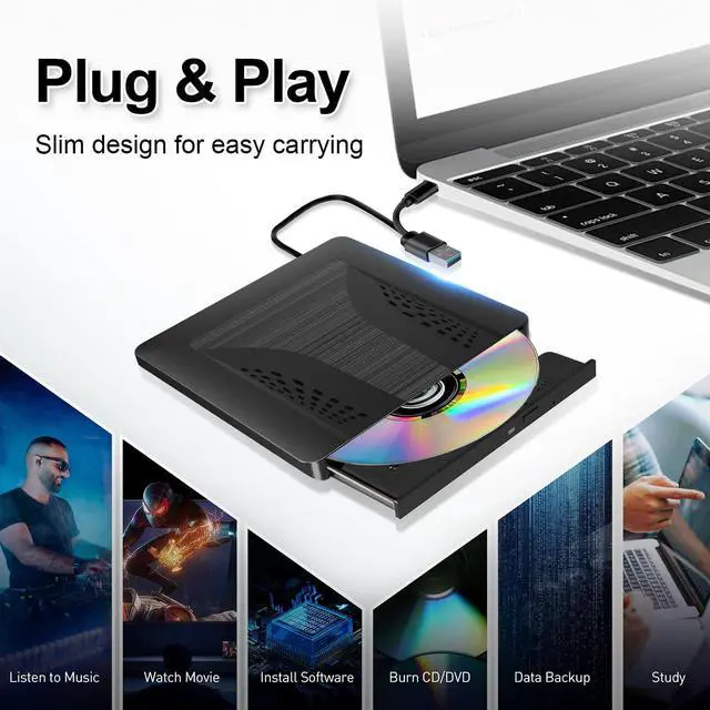 Ultra thin and portable: This external CD ROM drive is portable and lightweight, the integrated data cable is easy to use and organise, and the anti-bounce rubber pad prevents it from slipping on the desk, so you can easily use it. Put it in the laptop bag of your computer and carry it at home, in the office or anywhere. It is a good gift for fans who collect CDs and DVDs. Enjoy your life.