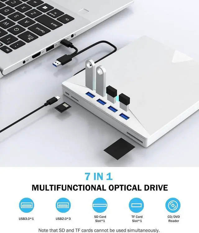 - 8-in-1 External DVD Drive for Laptops: This versatile optical drive not only reads and burns CDs/DVDs but also serves as a practical USB hub, equipped with 4 USB ports, an SD card slot, and a TF card slot. Perfect for effortlessly transferring photos and videos from your camera to computer via memory cards. (Note: SD and TF reader cannot be used at the same time.)