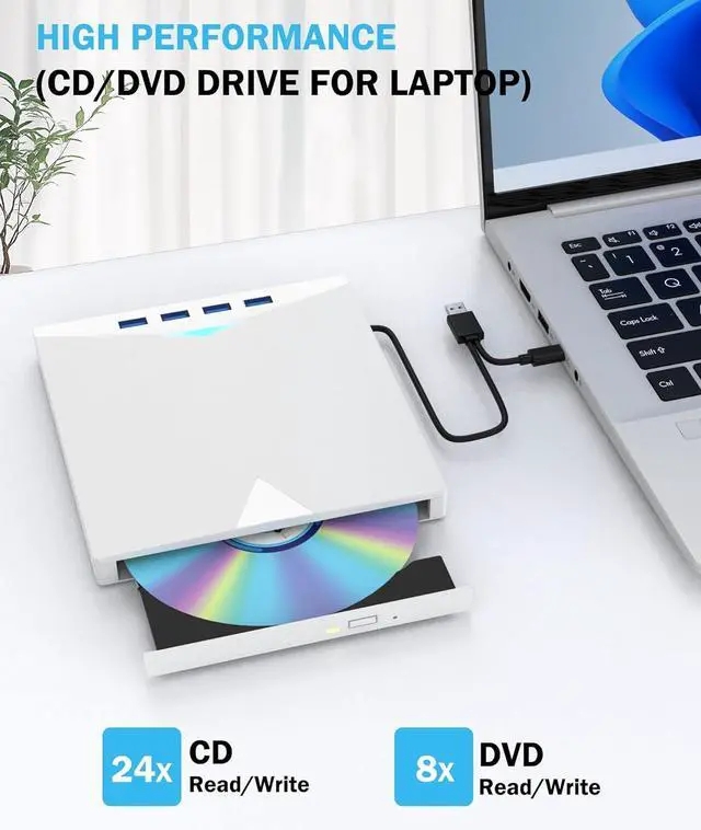 - Verified Compatibility: This USB external CD/DVD drive works with a wide range of devices including MacBook, iMac, notebooks, desktops, and laptops. It is compatible with Windows 11/10/8/7/XP, Vista, Linux, and Mac OS 10.6 or above. (For Windows 11, a media player and internet connection are required for certain features.)