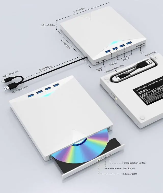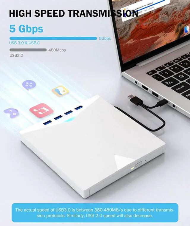- 7 RGB Gradient Lighting Modes: This external CD drive features built-in soft gradient lighting effects, creating a romantic and cozy immersive atmosphere. With a sleek and lightweight design weighing only 0.38kg, it is highly portable. The embedded cable ensures easy use and tidy storage, making it effortless to slip into your laptop bagperfect for use at home, in the office, or on the go.
