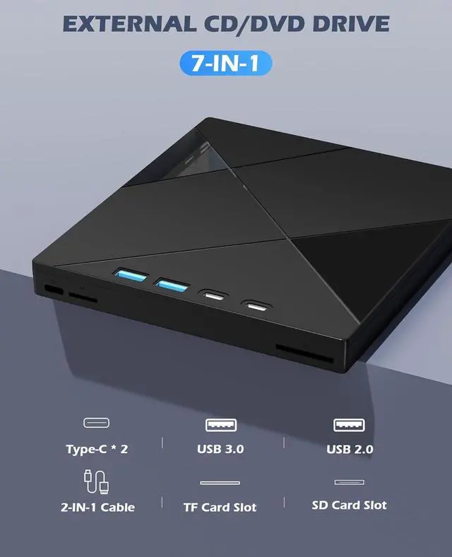 | Features | This offers versatile features. It supports reading and writing DVD/CD discs. You can easily copy music, movies, and data files from SD cards, TF cards, or through the USB/Type-C ports to your computer. Please note that the SD card and TF card cannot be used simultaneously; you can only choose one at a time. However, both of them can function simultaneously with the USB 3.0 ports. |
