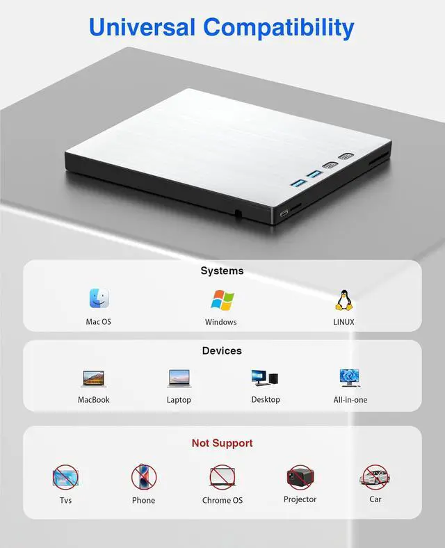 Step2: Insert your CDs or DVDs, Use a media player. If playing Blu ray disc, it is necessary to download Blu ray playback software in advance. (For Windows, such as PowerDVD,VLC etc. For Mac OS, such as Macgo Blu ray Player,etc.) Pls make sure Blu-ray playback software is compatible with your computer system. Test it by downloading the software 'Cyberlink BD & 3D Advisor'. The software will verify whether your computer is equipped for Blu-ray or 3D playback. This product does NOT include playback software.