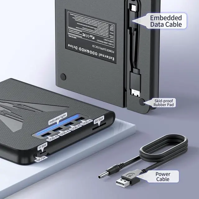 It comes with an embedded USB 3.0 + Type-C cable for easy plug-and-play use, plus an additional 5V round power connector for stable operation with high-capacity discs.