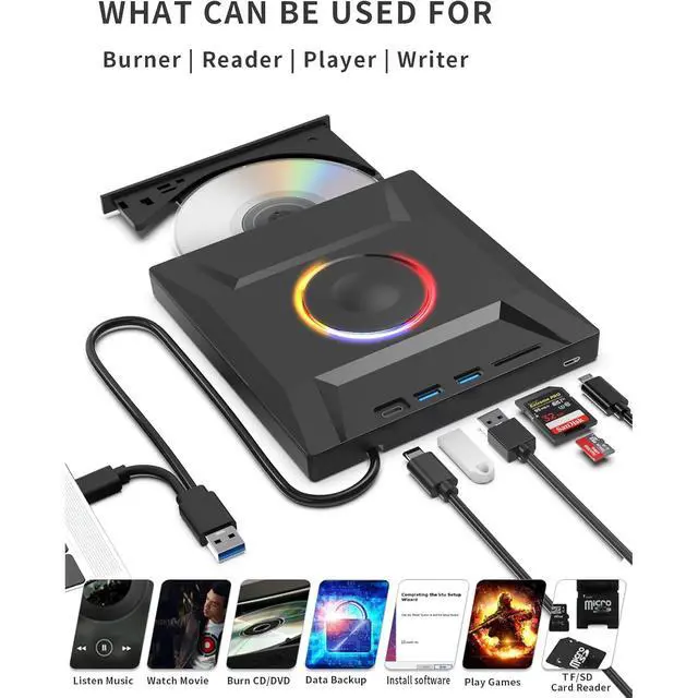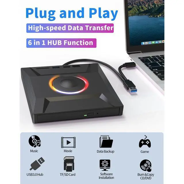 Plug & Pla: Ideal for those who need a reliable external CD/DVD drive for reading and writing discs, this highly functional 6-in-1 device also offers extra ports to connect other peripherals. No complicated setup required-just plug the integrated data cable into your laptop, and its ready to use. Insert your disc and use your preferred software to player, burner, reader, writer or backup content.