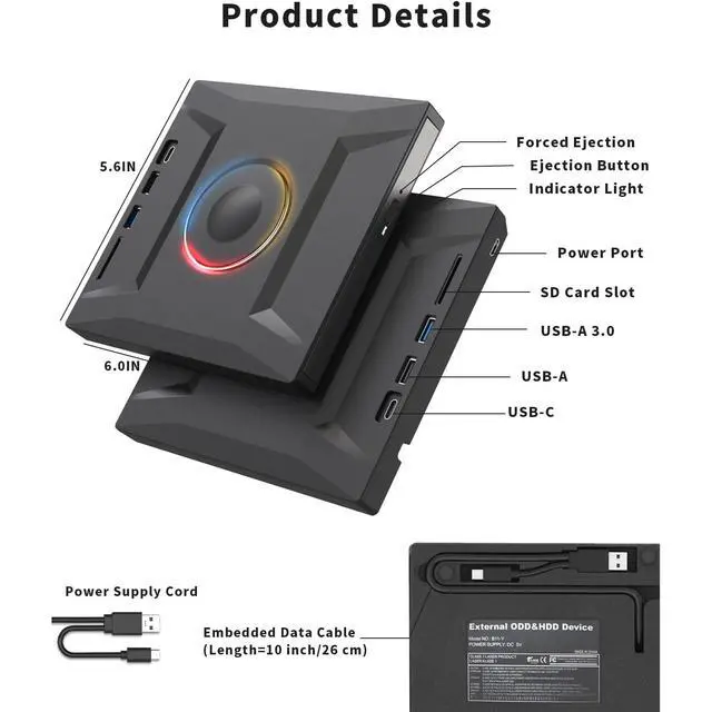 Plug & Play Multifunctional CD/DVD Drive for Laptop: Ideal for those who need a reliable external CD/DVD drive for reading and writing discs, this highly functional 6-in-1 device also offers extra ports to connect other peripherals. No complicated setup required-just plug the integrated data cable (conveniently stored underneath) into your laptop, and its ready to use. Insert your disc and use your preferred software to player, burner, reader, writer,or backup content.