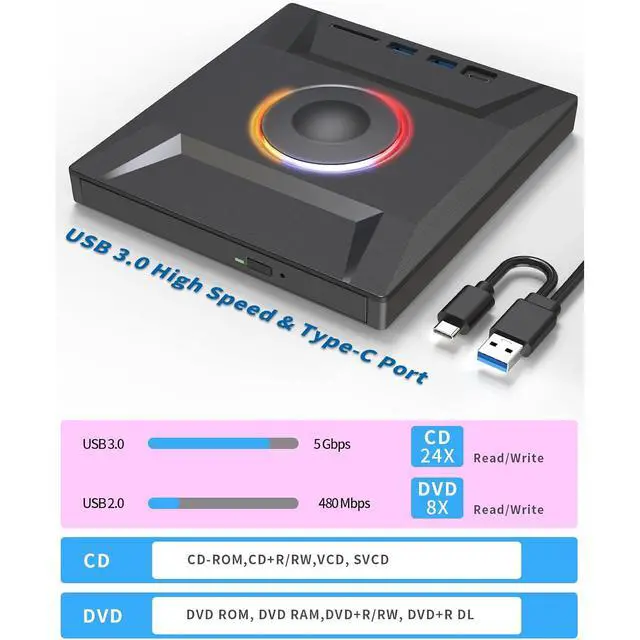 USB 3.0 High Speed Data Transfer: with high speed USB 3.0 and Type-C technology. Experience rapid data transfers with advanced USB 3.0 technology, which is approximately 10x faster than USB 2.0 (rates up to 5 Gigabits/S 625MB/S),Brand-new loader with strong error correction, low powerconsumption,and high speed. The portable CD DVD player supports writing speeds up to 24x for CDs and reading speeds up to 8x for DVDs, ensuring efficient, smooth and stable operation,faster than you expected.