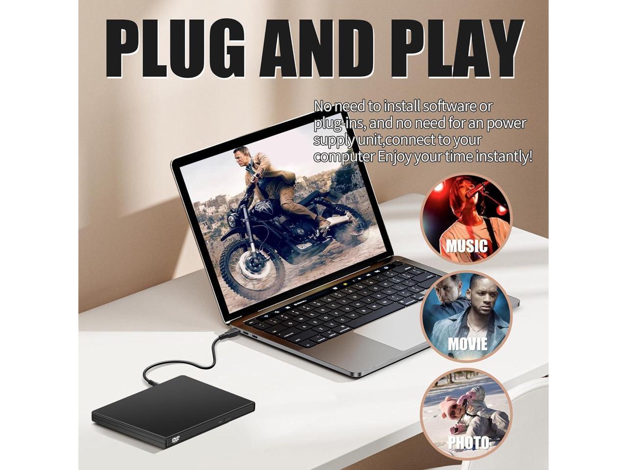 - [DVD DRIVE PLUG AND PLAY] Does not require any driver or power supply.Just plug the external DVD drive into your USB port, touch the inductive open button, insert the disc and the disc is instantly detected and ready to use immediately