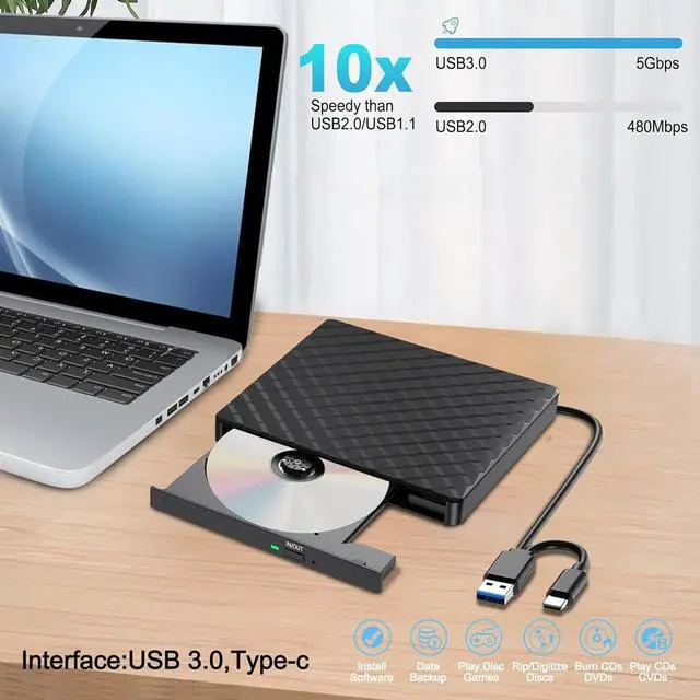 - High-speed interface: The ultra-slim DVD burner player uses USB 3.0 + Type-C technology. It allows for faster data transfer speeds. Bring you faster and smooth experience during movies, musics.
