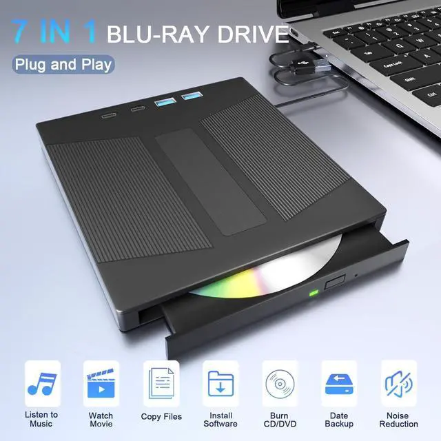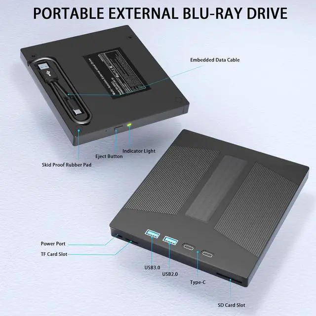 Compared to a standard external Blu-ray drive, this product Support 100G BD disc reading & writing. This blu-ray dvd player features an advanced high-speed 3.0 interface that reaches a maximum speed of 5Gbps, which is 6 times faster than traditional 2.0 (480Mbps). Additionally, the Type-C interface has strong error correction capabilities, impact resistance, and low power consumption, ensuring stable and reliable data transfer. And our drive can read BD discs at speeds of up to 6x, DVDs at up to 8x, and CDs up to 24x.