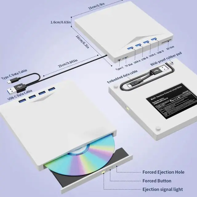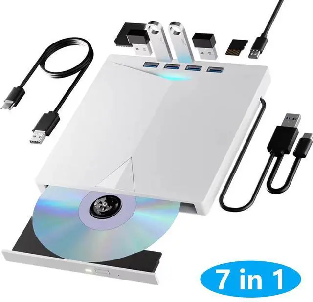 7 in 1 USB 3.0 HubNot only is it a CD DVD player and recorder, the usb cd/dvd external drive can also be used as a USB 3.0 hub, including USB A 3.0 port*1, USB A 2.0 port*3, TF card slot*1, SD card slot*1, compatible with usb hard drive, flash drive, mouse, keyboard and other usb computer accessories.(Note: SD port and TF port cannot be used at the same time. )