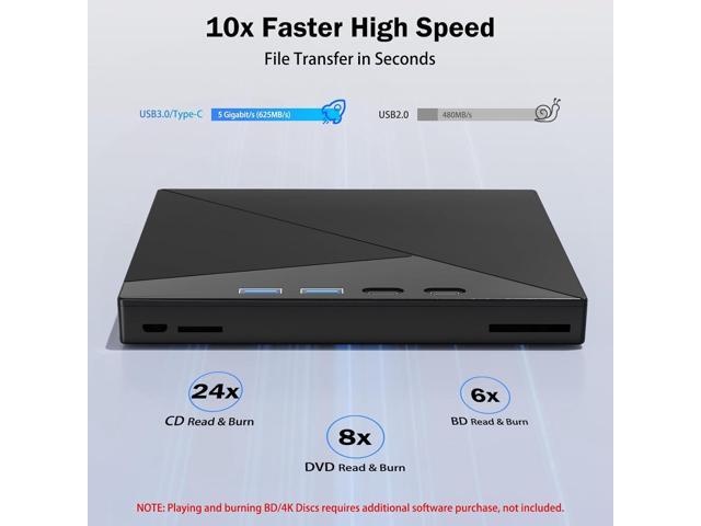 - High Performance: High-speed 3.0 and Type-C interface exhibit exceptional error correction capabilities, impact resistance, low noise, and low power consumption. It can read CDs at speeds of up to 24x, DVDs at up to 8x, and BDs at up to 6x. Additionally, it supports burning normal CDs and DVDs in sizes of 8.5GB, 4.7GB, and 700MB, as well as 3D discs.