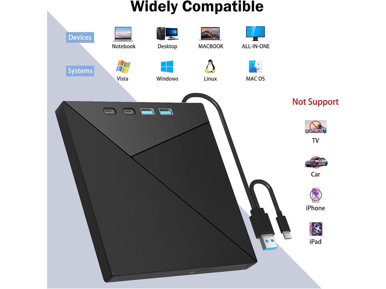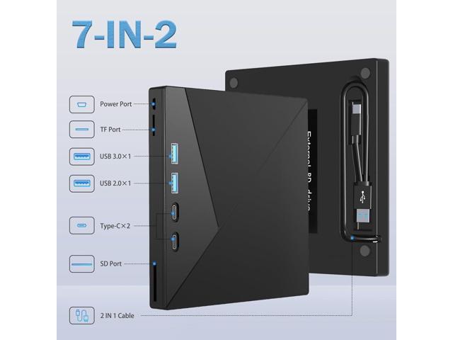 - Multifunction:This 7 in 1 external drive can read and write BD/DVD/CD discs and has 1 SD card slot, 1 TF card slot, 2 Type-C, 1 USB 2.0, 1 USB 3.0 port for data transfer or charging purposes. You can easily transfer music, 4k blu ray uhd movies, and data files from SD cards, TF cards, or through the USB/Type-C ports to your computer.