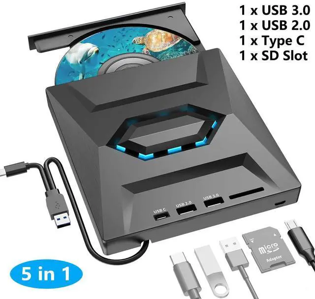 5 in 1 External CD/DVD Drive: This CD DVD to laptop converter not only reads CDs and DVDs, but can also be used as a USB hub. Including 1*USB 2.0 Port, 1* USB 3.0 Port, 1*Type C Port, 1*SD Card Slot.