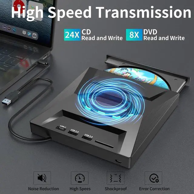 This CD DVD to laptop converter not only reads CDs and DVDs, but can also be used as a USB hub. Including 1*USB 2.0 Port, 1* USB 3.0 Port, 1*Type C Port, 1*SD Card Slot.The USB Hub makes it easy to connect the mouse, keyboard and other USB devices. You can also use the card reader function to transfer your photos, videos or data to PC.