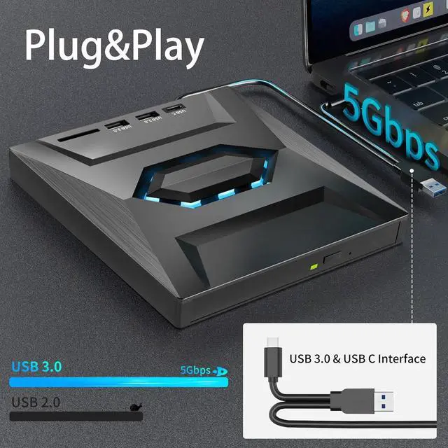 High-Speed USB3.0/Type C DVD Player for Laptop: The portable CD/DVD drive utilizes USB 3.0 technology and is backward compatible with USB 2.0. It supports data transfer rates up to 5Gbps. The cd/dvd drive offers Max 8x DVD Read Speed and Max 24x CD Write/Read speed, faster than you expected.