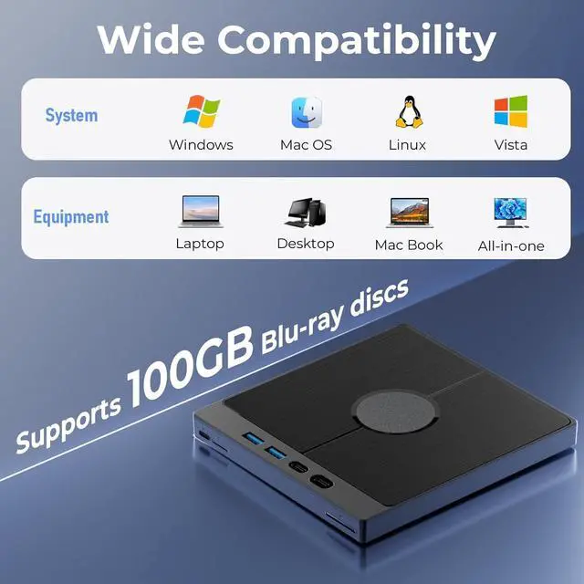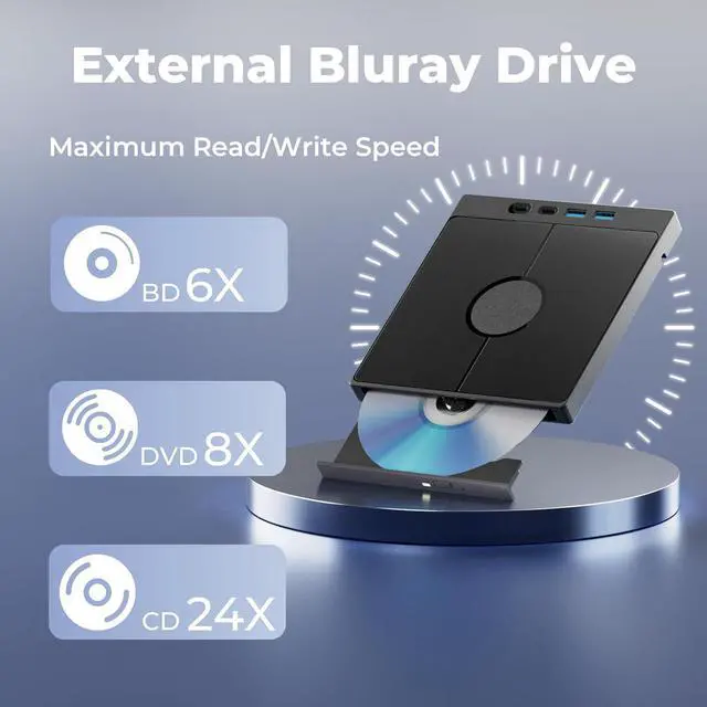 Support 100G Burning Technology: Compared to a usb drive external, this product Support 100G BD disc reading & writing, this blu ray dvd player features an advanced USB 3.0 interface that reaches a maximum speed of 5Gbps, which is 6x faster than traditional 2.0 (480Mbps). Additionally, the Type-C interface has strong error correction capabilities, impact resistance, and low power consumption. And our drive can read BD discs at speeds of up to 6x, DVDs at up to 8x, and CDs up to 24x.