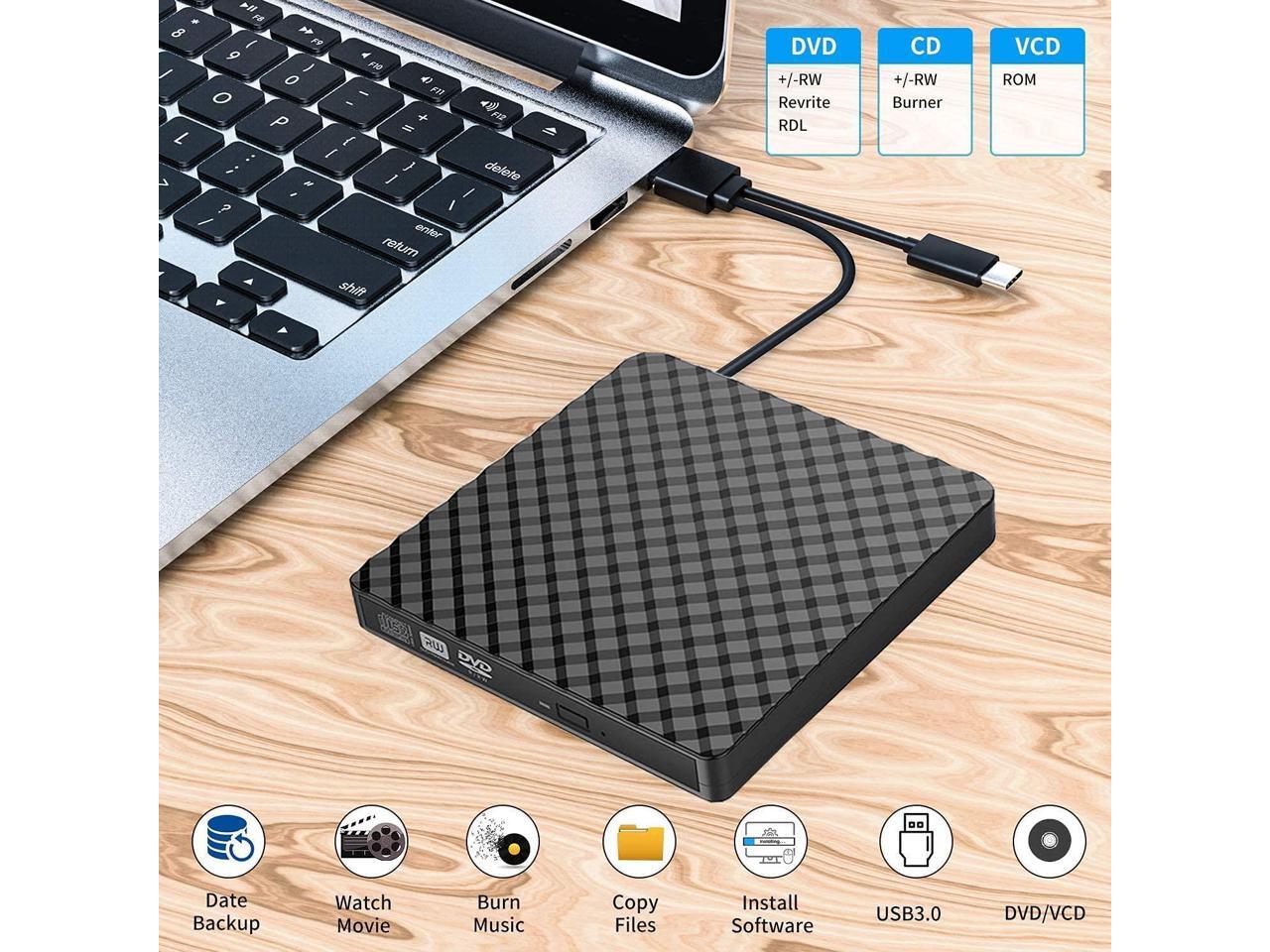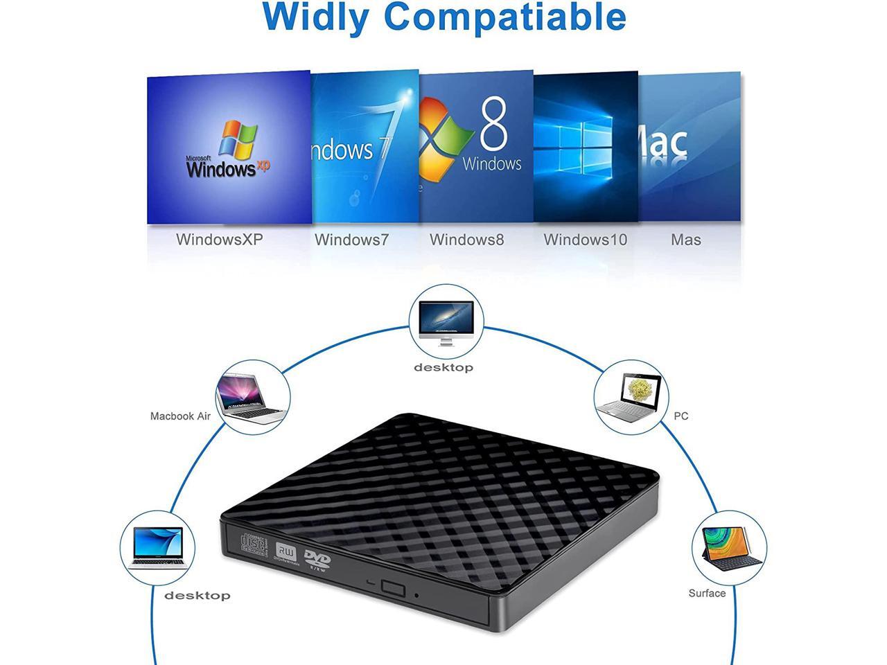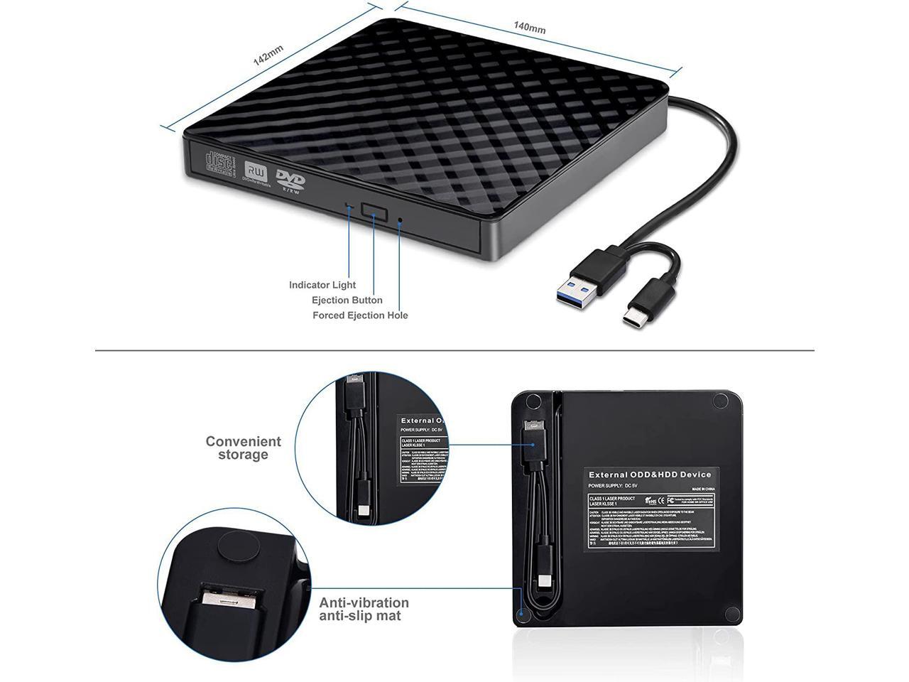 - [WIDE Compatible] Supports to read CD,VCD,SVCD,CD-R/RW,DVD-R/RW and burn CD+/-RW,DVD+/-RW, etc. DVD-/+RW burner adds a USB C adapter that can support different devices. Compatible with Windows XP/2003/Vista/7/8.1/10/11, Linux, all version Mac OS, Laptop, Desktop PC.
