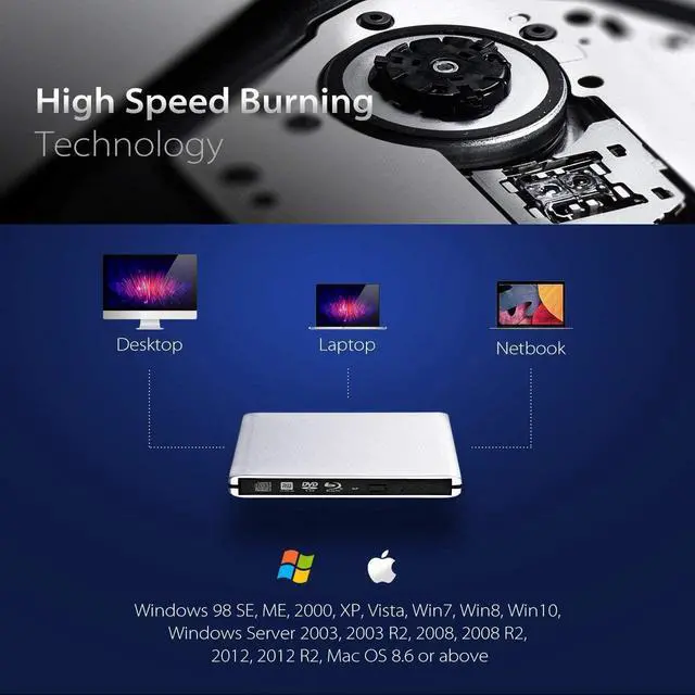 Super Fast for Reading Blu-ray DVD CD 3D discs:Biscon external blu ray drive allows you to read and burn blu-ray discs (BD), CDs, as well as DVDs.This external bluray dvd drive reads CD discs at up to 24x,DVD disc at up to 8x,and Blu-Ray disc at up to 6x.The usb bluray drive supports 8.5G 4.7G 700M CD DVD burning capabilities.