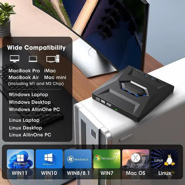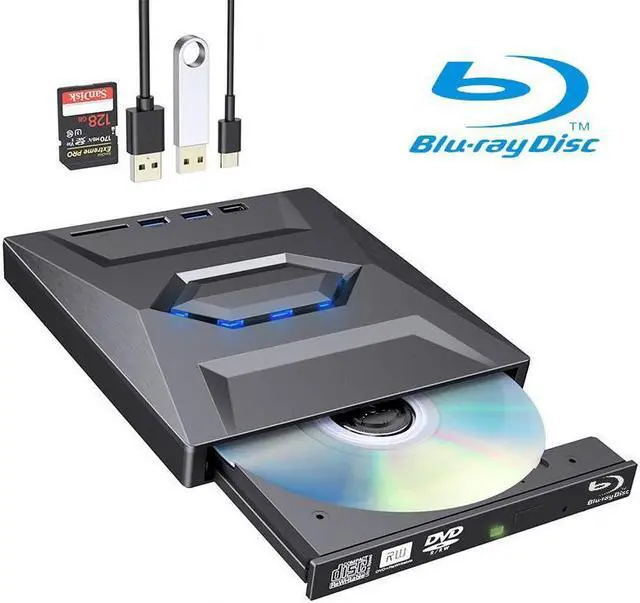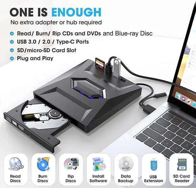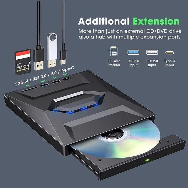 3. Additional Expansion Interface-----This device is not only a CDs and DVDs player reader writer rewriter ripper recorder but also functions as a USB hub, featuring 1* USB 3.0 port, 1* USB 2.0 port, 1* USB type-C port, and 1* SD card slot. It's convenient to connect other computer accessories on demand, such as an external hard drive, wired/wireless mouse or keyboard, USB flash drive, and SD card reader is perfect for transferring camera photos/videos from card to PC.