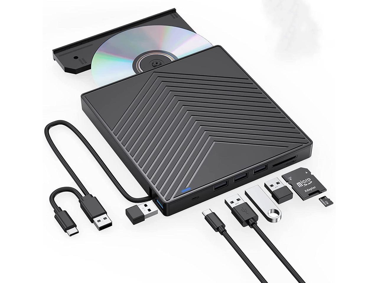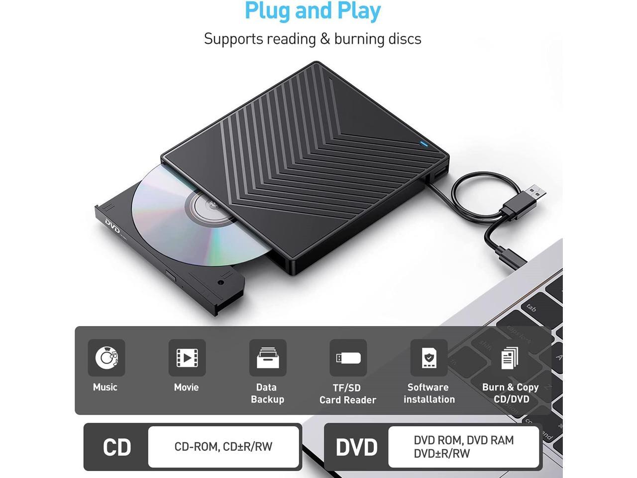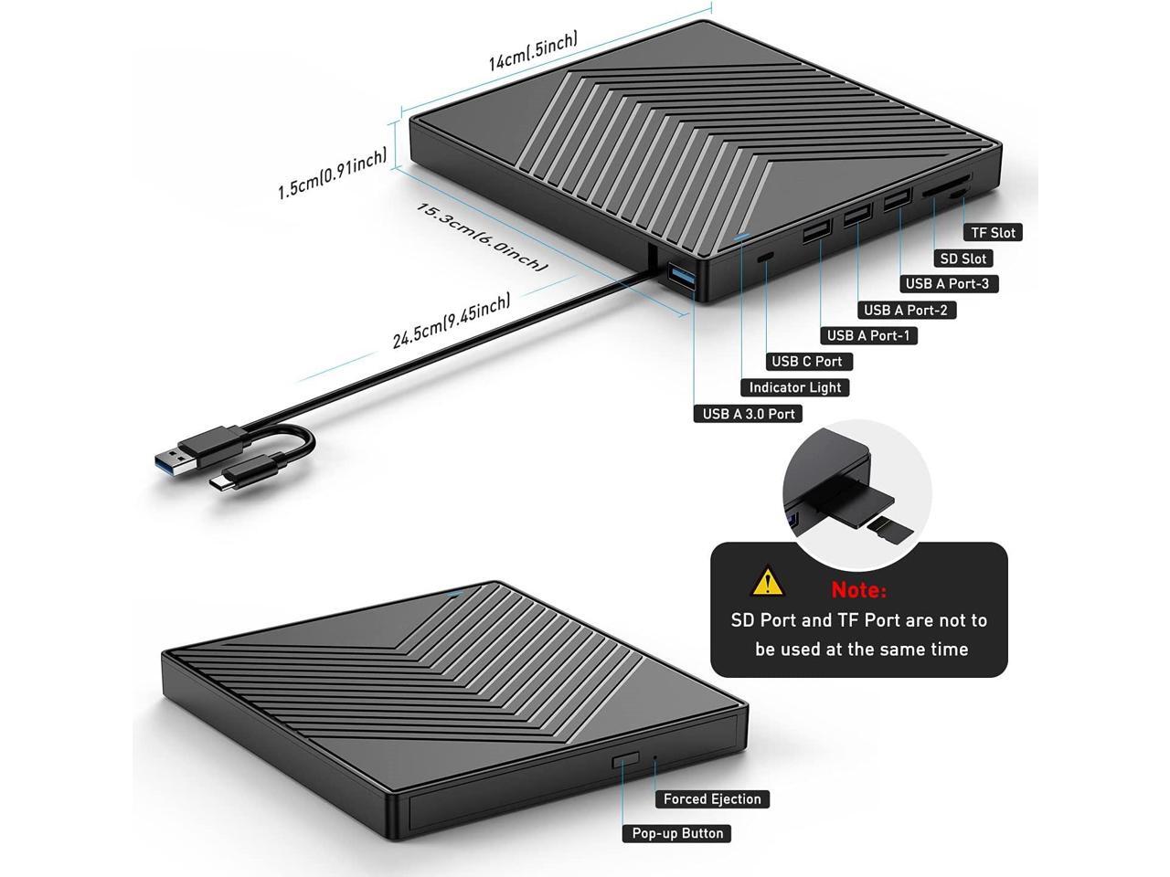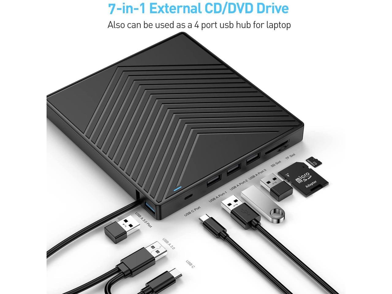 - ?7 in 1 USB HUB?- Our external drive can not only burn and read CD DVDs, but also can be used as an external USB hub for laptops, including 1 USB 3.0 port 3 USB 2.0 ports 1 TF slot 1 SD card slot and 1 USB C port, compatible with USB hard drives, (Note: SD port and TF port cannot be used at the same time)
