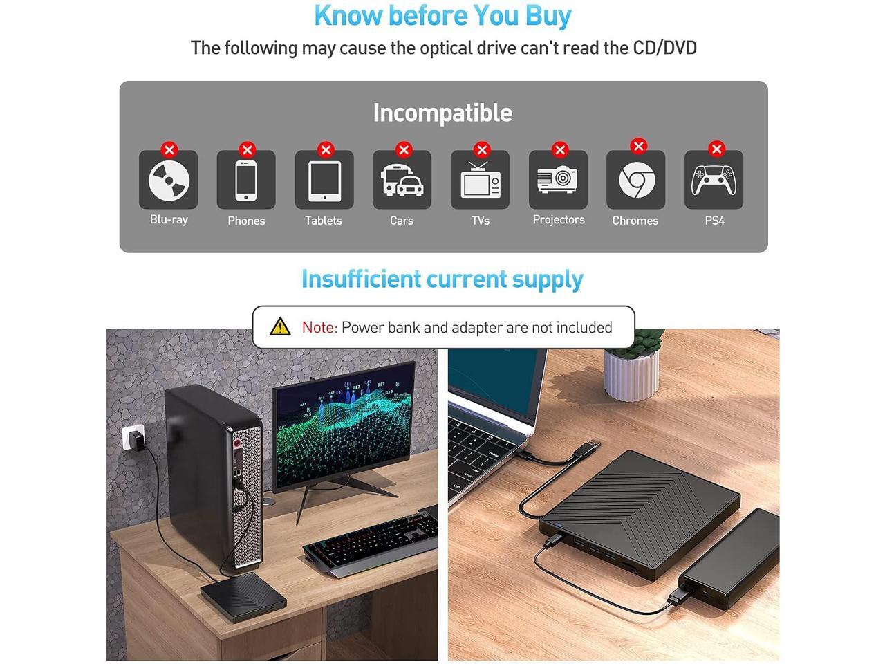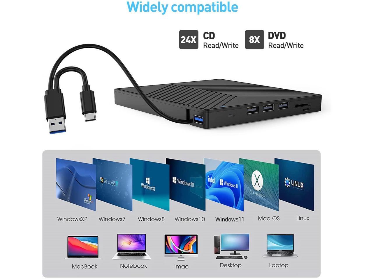 - ?Support CD and DVD Burning?- The optical drive supports reading and writing of CD±R/RW, CD-ROM, DVD±R/RW, DVD-RAM, VCD and SVCD. Also, this USB-A and USB-C external disk drive supports different devices like Macbook, iMac, Laptop, Desktop and Notebook. Compatible with Windows11/10/8/7/XP, Vista 7/8, Linux, Mac OS10.6 or later.