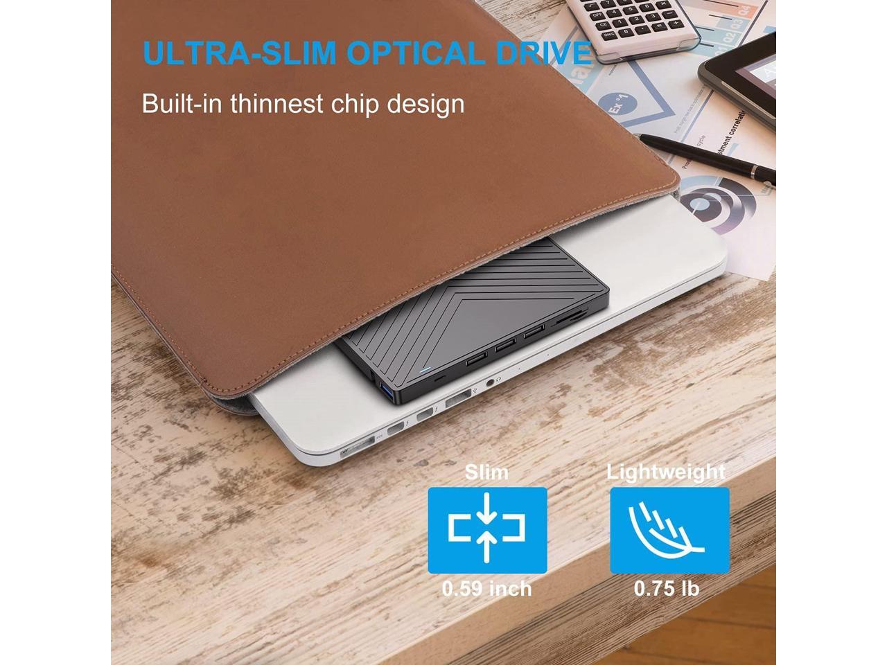 - ?Ultra Slim Portable Design?This external disk drive is very slim and lightweight, the embedded data cable is easy to use and organize, the non-slip rubber pad prevents it from sliding on the desktop, so you can easily carry your laptop home, office or any local package. It's also a good idea to give it as a gift to anyone who collects CDs and DVDs.