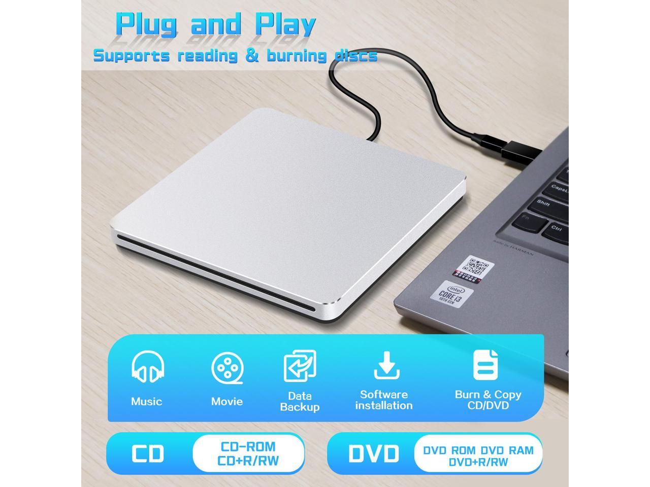 - Multiple Functions: After installed this external CD/DVD drive, insert CDs/DVDs, you can use a playback software, burning software and ripping software to complete various tasks such as watching DVD movies, burning/ripping CDs & DVDs, installing software/system/games, backing up data to discs, and more.This drive supports CD±R/DVD-RW/DVD±R/CD-ROM/DVD-ROM/DVD-R DL/VCD-ROM/DVD+/-RW.