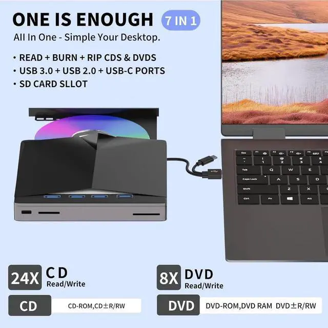 7 IN 1 Optical Drive: Our portable DVD player is not only a CD/DVD reader, but also a CD/DVD burner/burner, 4 port USB 3.0 hub, SD card reader, TF card reader (SD card and TF card are not used at the same time)