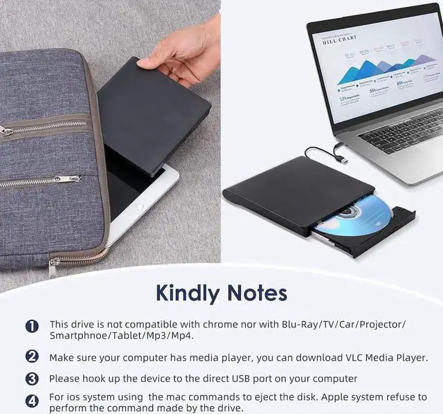 Of course, it should be noted that this external CD/DVD player is only compatible with Windows, Apple Mac, and Linux computers. It CAN NOT work with Chromebooks, smartphones, tablets, TVs, cars, projectors, PlayStation, Ubuntu, or Blu-ray discs.