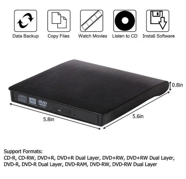 Compatibility is extensive, spanning Windows 98 SE to Windows 10, various Mac operating systems, and even Surface Pro. This versatile drive supports a range of disc formats, including DVD-RAM, DVD-R, DVD-RW, DVD+R, DVD+RW, CD-R, CD-RW, and CD-ROM.