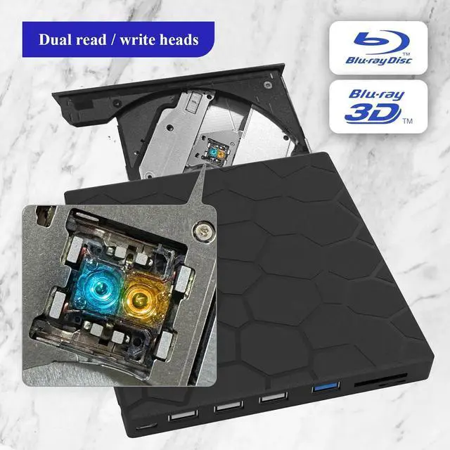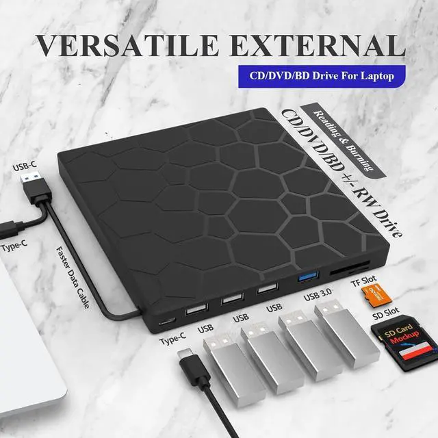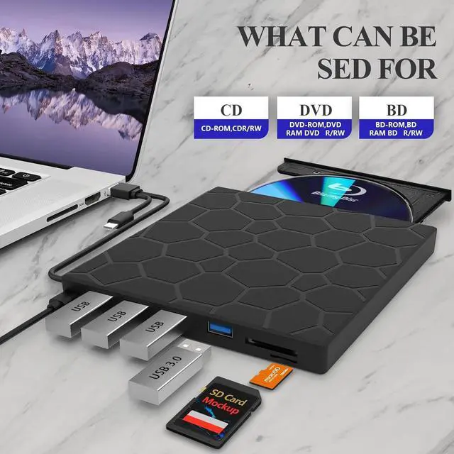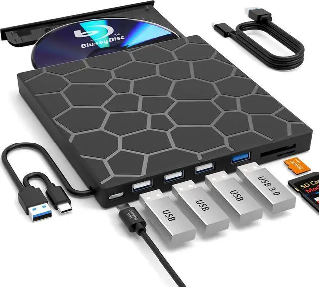 External blu ray drives is a 7 in 1 drive with 4 USB ports and SD/TF slot for reading files/photos/videos between your computer and external storage device.