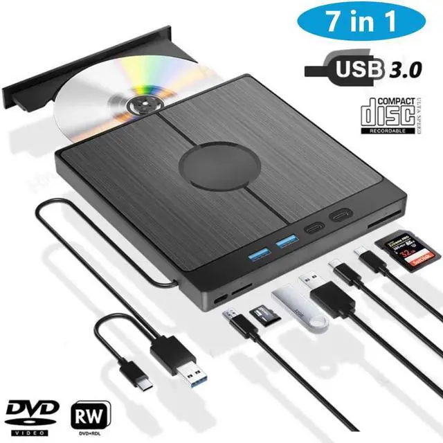 7 in 1 External CD/DVD Drive Portable CD/DVD Burner with 2 USB/Type-C Ports USB 3.0 CD/DVD Disk Drive Player Burner Reader Writer 1 TF/SD Card Slots Optical Drives for Laptop Desktop PC