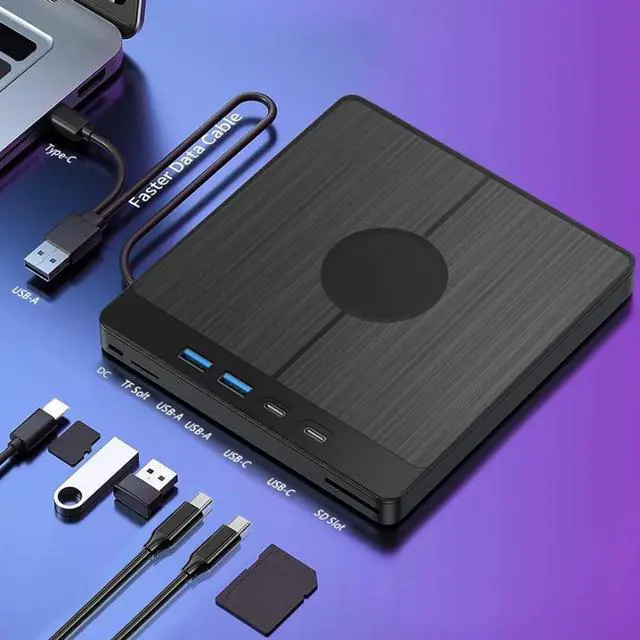 Optical Drive: Maximize your data management with our external CD/DVD drive, a multipurpose powerhouse offering USB 3.0 's rapid 5Gbps transfer rates. As a versatile CD/DVD player and burner, it boasts additional ports for USB devices and dedicated slots for SD/TF cards, ensuring you can handle everything from file transfers to multimedia with ease. (Note: SD and TF card slots cannot be used simultaneously. )