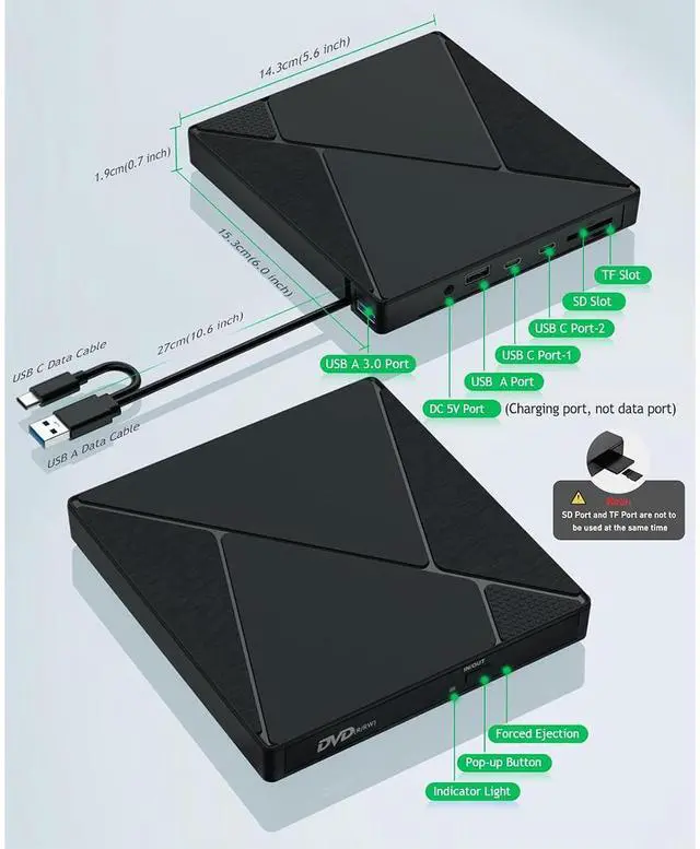 It is not only CD/DVD burner, but also a USB 3.0 hub, including USB A 3.0 port*1, USB A 2.0 port*1, USB C port*2, TF card slot*1, SD card slot*1. Extra built-in SD/TF card reader is perfect for you to transfer photos shooting or videos by your camera from memory cards to your computers.