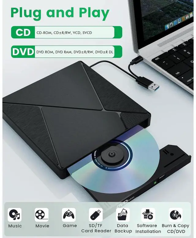 Fortunately, We have already done all the work for you. This multi-function 2 in 1 USB A/USB C data cable external USB 3.0 disc drive that we launched is not only a CD/DVD reader, but also it has the function of CD/DVD burner. At the same time, it is equipped with a variety of USB ports and SD/TF card slots to meet all your peripheral equipment needs - all for a decent price. This will allow you to have more budget to buy the latest laptops that are comfortable, smooth, and have powerful processors and graphics cards.