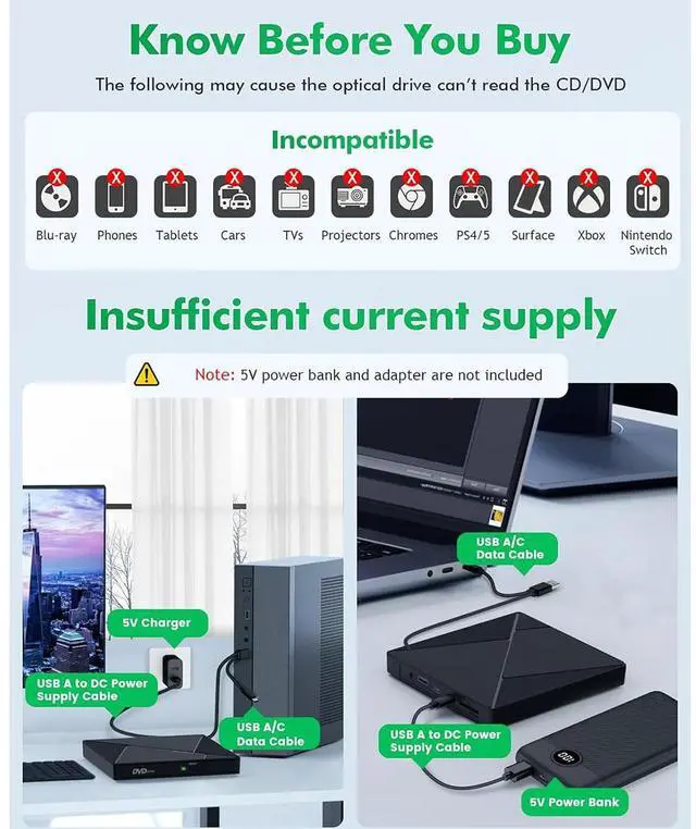 | Supplement power to the drive | It's better to use the 5V charger/power bank to increase the power if your computer don't have enough power to support the external drive. Note: For the Apple computers, you need to connect the external CD/DVD drive to the mac/macbook/imac through the USB A/C data cable first, and then connect the 5V charger/power bank to the external CD/DVD drive through the charging cord, otherwise the Apple computer will not recognize the external CD/DVD drive. |