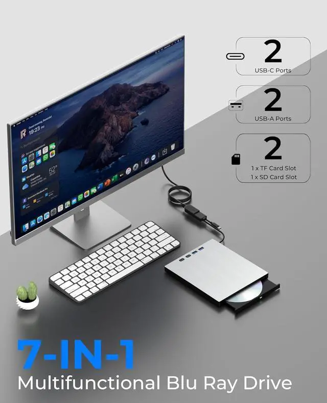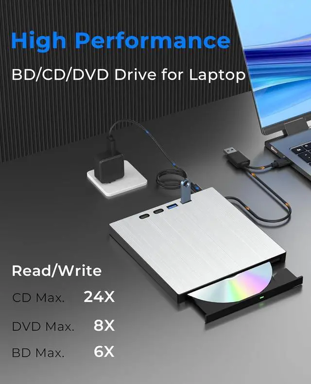 For Windows OS: You can see the BD RW icon in Windows Explorer. Use the data cables on the back (bottom) of the optical drive to connect your computer's USB port or desktop computer host. We have a power cord that we recommend using together. Do not connect USB extension hub.