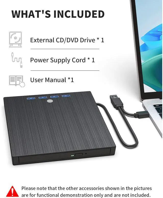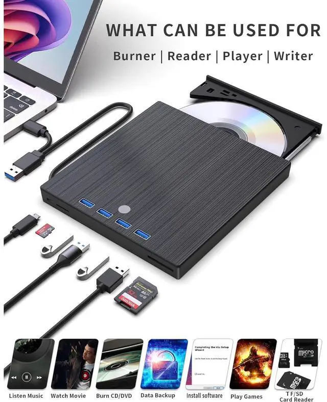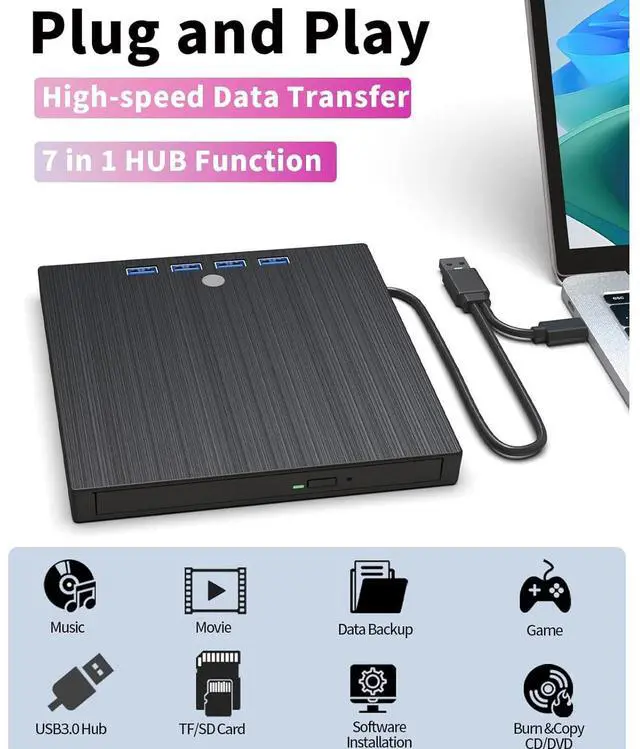 Plug & Play Multifunctional CD/DVD Drive for Laptop: Ideal for those who need a reliable external CD/DVD drive for reading and writing discs, this highly functional 8-in-1 device also offers extra ports to connect other peripherals. No complicated setup requiredjust plug the integrated data cable (conveniently stored underneath) into your laptop, and its ready to use. Insert your disc and use your preferred software to player, burner, reader, writer,or backup content.