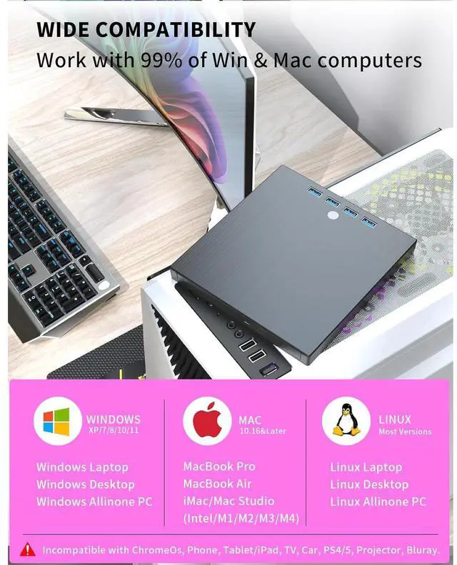 Broad System Compatibility:Working seamlessly with Windows 11, 10, 8.1, 7, Vista, XP, 2000, ME, and 98, alongside most Linux distributions. It is also fully compatible with MacOS 10.16 or later. For optimal power stability with desktop computers, connect directly to a rear USB port. Note: Not compatible with ChromeOS (Chromebooks), iPads/tablets, TVs,vehicles (cars/trucks),some Surface models, or Blu-ray/4K discs.
