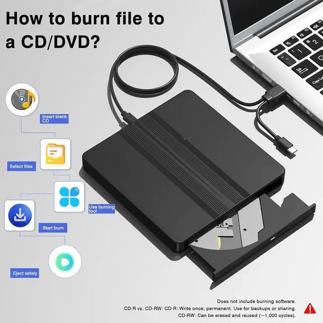 Wide Compatibility: Compatible with Windows 11/10/8/7/Vista/XP/2000/98/SE/ME, Mac OS, and Linux systems. The external CD/DVD drive supports CD+/-R/RW, CD-ROM, DVD+/-R/RW, DVD+/-R DL, DVD-ROM, DVD-RAM, VCD, and SVCD formats. Please note that Blu-ray discs are not supported. Windows 11 requires the installation of a media player (e.g. VLC).