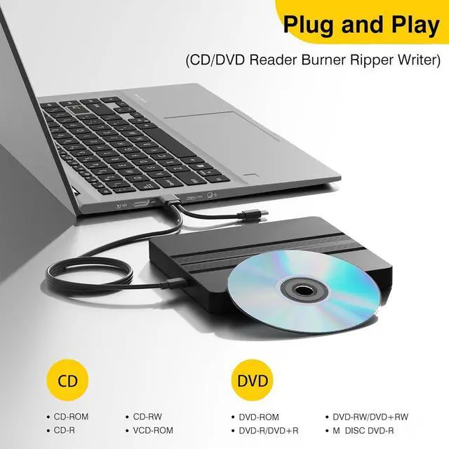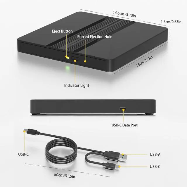 Extra-Long Cable, Plug & PlayThis CD/DVD Burner comes with an extra-long 31.5-inch cable for flexible placement. No external power or drivers are required just connect via its 2-in-1 USB-A/USB-C cable for CD/DVD read and write.