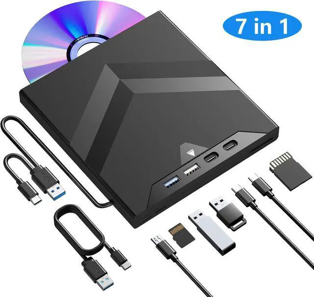 [7-1 External CD/DVD Drive]:This 7-in-1 External Drive is the ultimate all-in-one solution for your digital life, featuring a comprehensive set of 7 portsincluding SD and TF card slots (note: not usable simultaneously), dual Type-C, USB 3.0, USB 2.0, and a power portto effortlessly handle all your needs from installing software and backing up data to enjoying music, movies, games, and reading or burning CDs, DVDs.