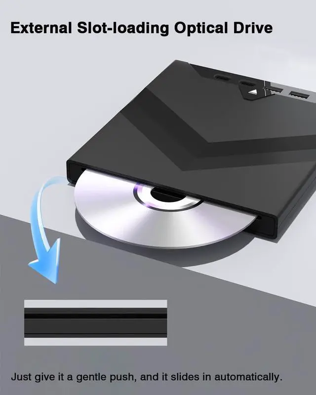 [Advanced Slot-In Inhalation Design]:Say goodbye to clumsy trays. The innovative slot-loading mechanism automatically draws in your disc, preventing dust from entering the core components. This enhances durability and reduces the risk of failure. A manual eject button is provided for easy disc removal if needed.
